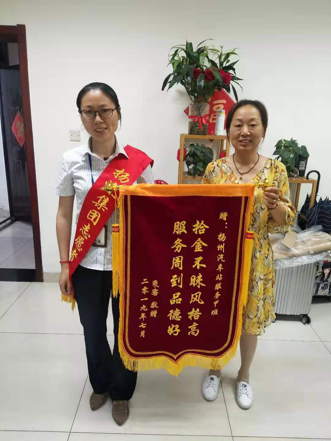 7月8日,一位揚(yáng)州市民王大媽?zhuān)弥\旗來(lái)到揚(yáng)州汽車(chē)站值班室,感謝車(chē)站服務(wù)班工作人員,幫她尋找到遺失的錢(qián)包。